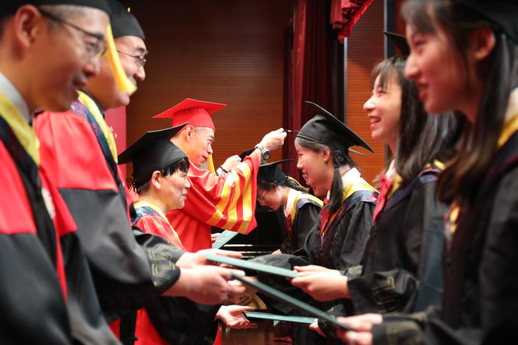 王春春、徐焕良、沈明霞、计智伟、林相泽、陆明洲分别为本科生、研究生扶正流苏,依次给获得学位的毕业生授予学位并合影。
