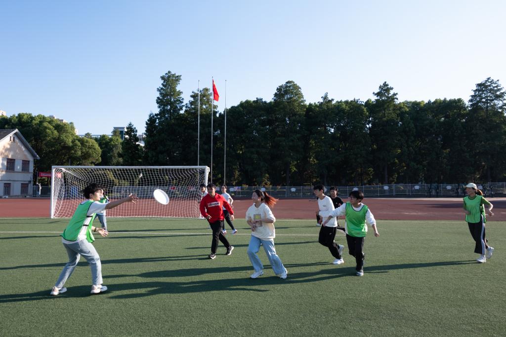 此外,运动会惊喜加入了近期非常流行的飞盘比赛项目,学院邀请到校外专业飞盘教练给学生进行培训并组织了一场表演赛。参与学生在操场上挥洒汗水、绽放笑容,比赛氛围瞬间达到高潮。
