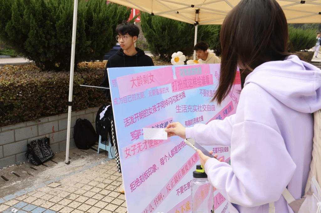 此外,男生可以写下一句想对女生说的话,鼓励女生勇敢做自己。活动最后,工作人员收集男生写的祝福语发送给参加活动的女生,并为女生们送上鲜花。活动现场气氛热烈,同学们参与热情高涨,活动最终取得圆满成功。
