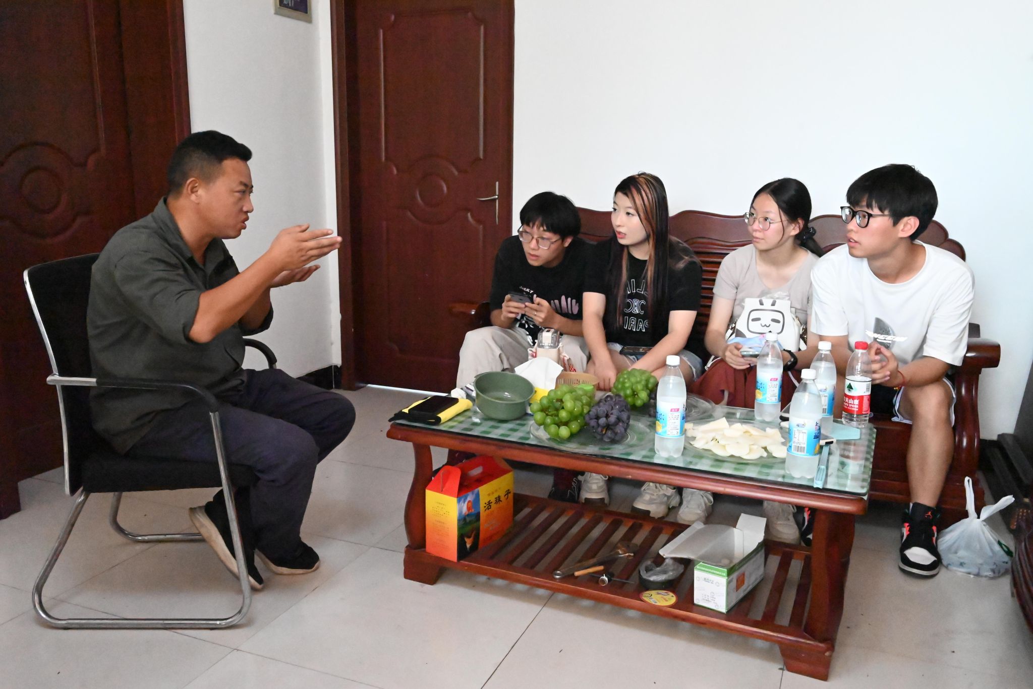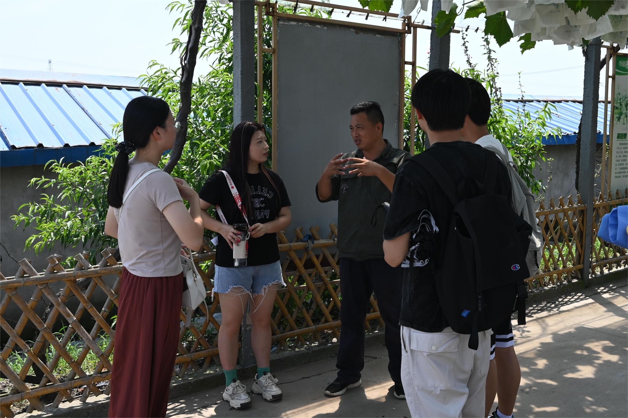 团队成员分组了解棚栽葡萄生长情况,详细记录园区各生产环节运行情况、使用的智能设备及升级迭代情况,并向周边农户调研小规模种植农户使用智能农业装备的情况,搜集农业生产种植技术的研究课题。实践团就已有技术和应用瓶颈同葡萄园区负责人吴新军、王步忠展开深入交流,收集葡萄园区的技术需求。接下来,实践团队将推动相关课题组跟葡萄产业园进行产学研对接,另一方面应农业园区邀请编制智能农业技术科普读本,促进助农科技成果的落地和转化。