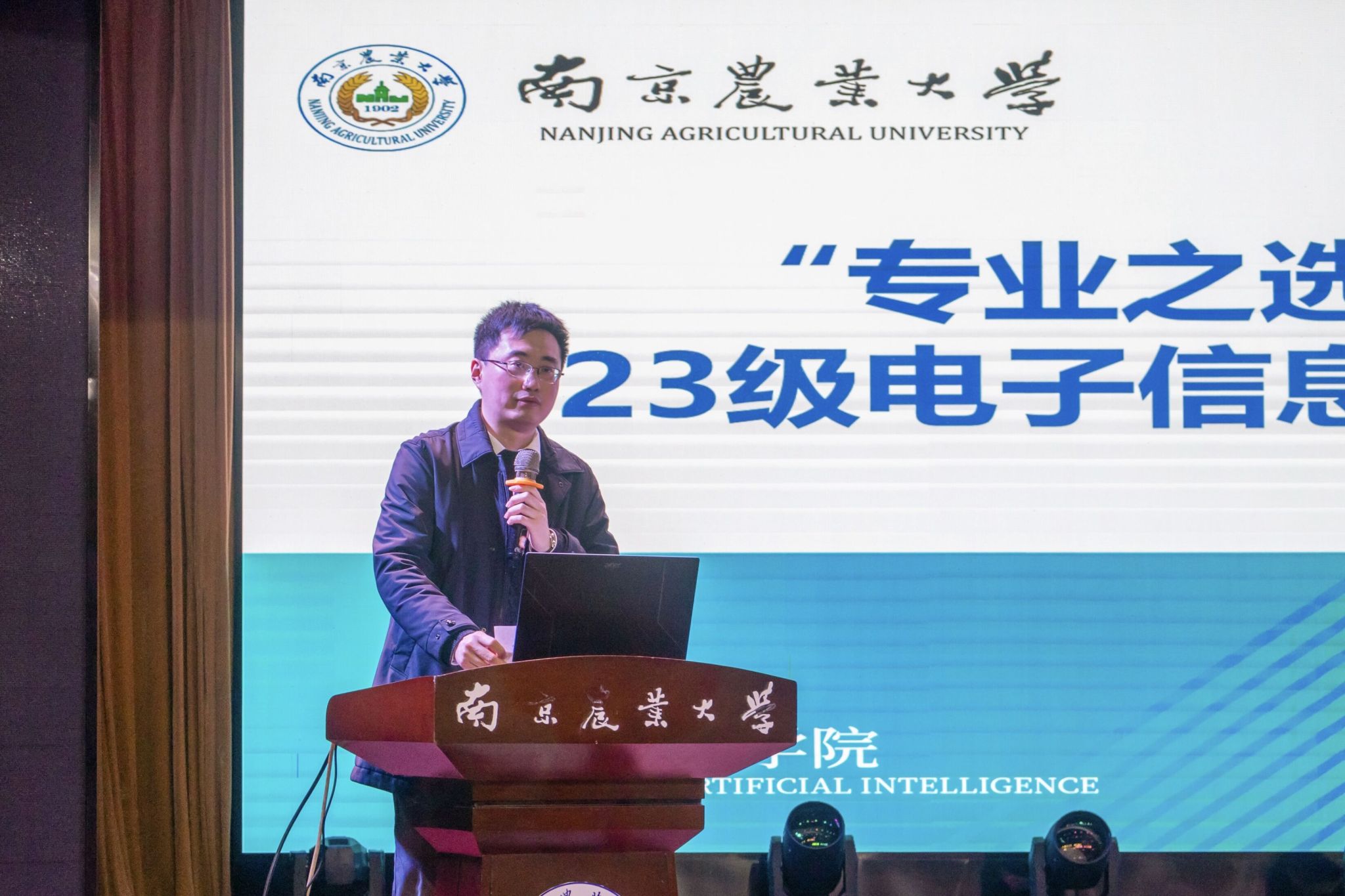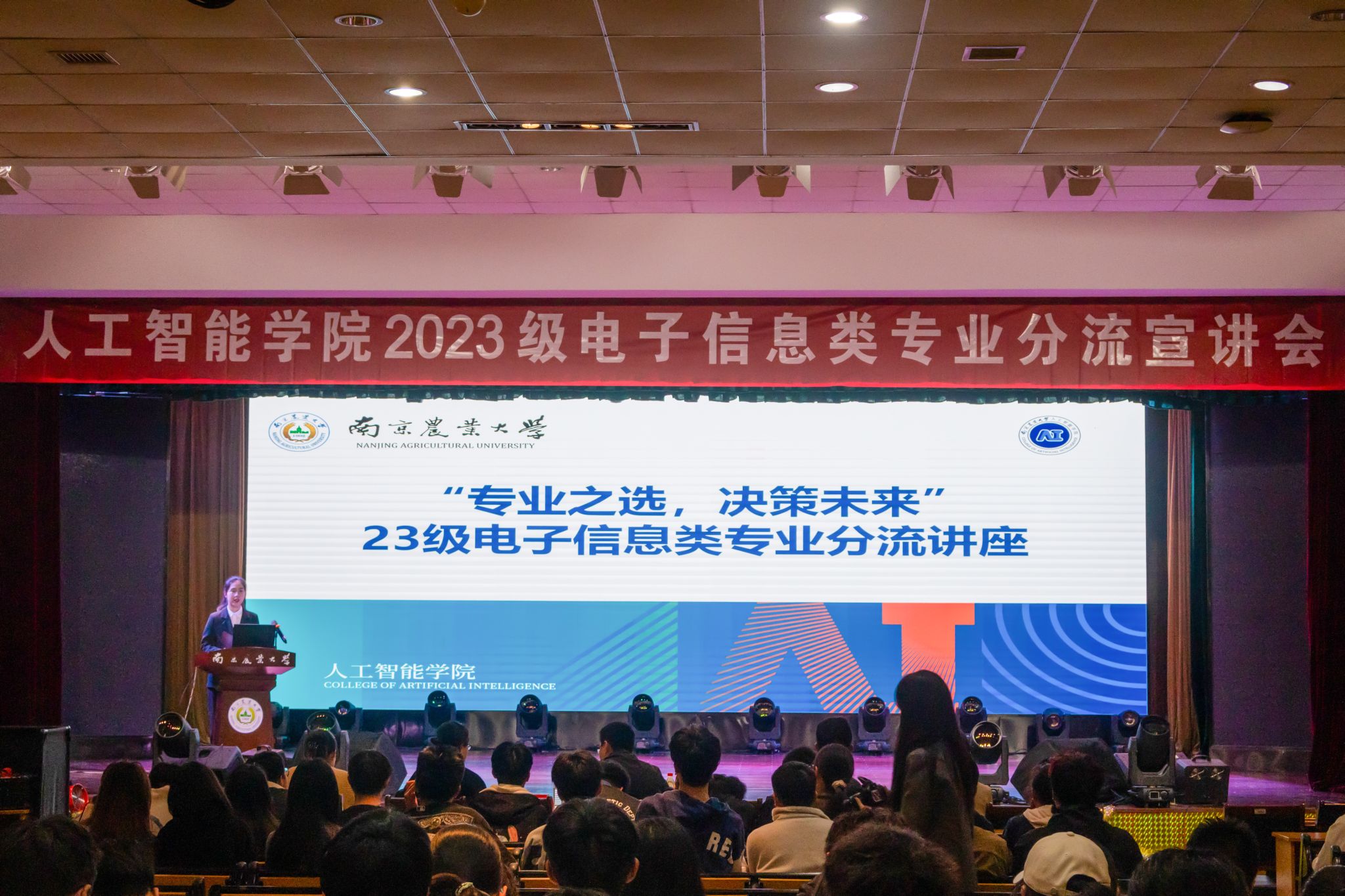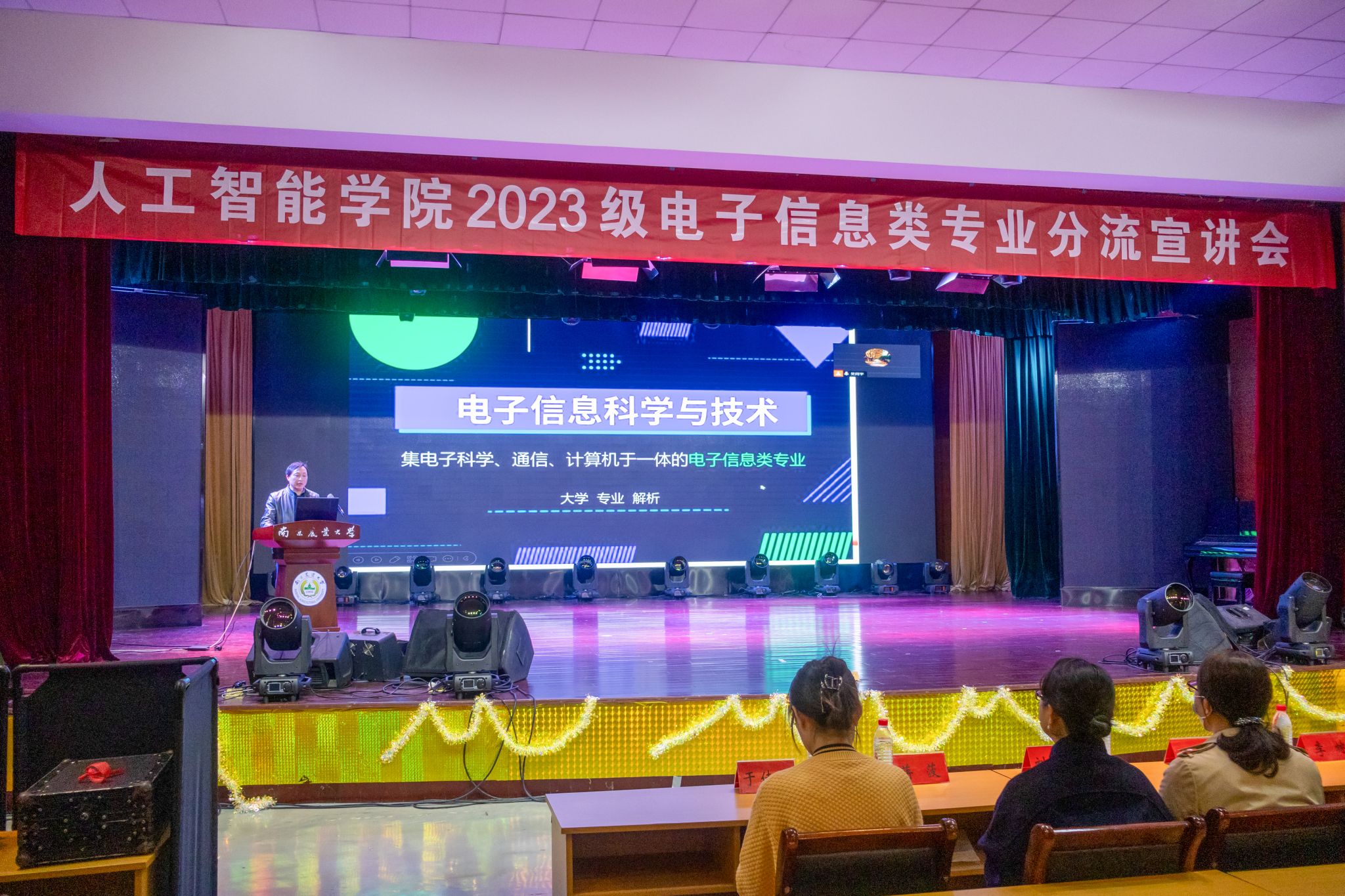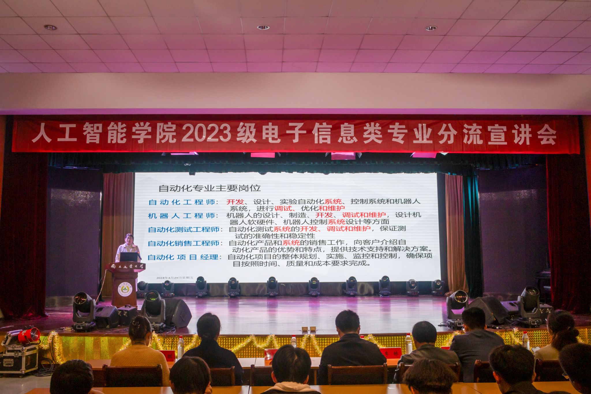 在大学生活动中心举办2023级电子信息类专业分流宣讲会。学院党委副书记吕一雷、自动化系主任刘璎瑛、电子信息系主任李林、教学秘书蒋菠、本科生专职辅导员湛斌、封筱、于佳琪出席本次讲座,2023级电子信息类全体学生参加活动。