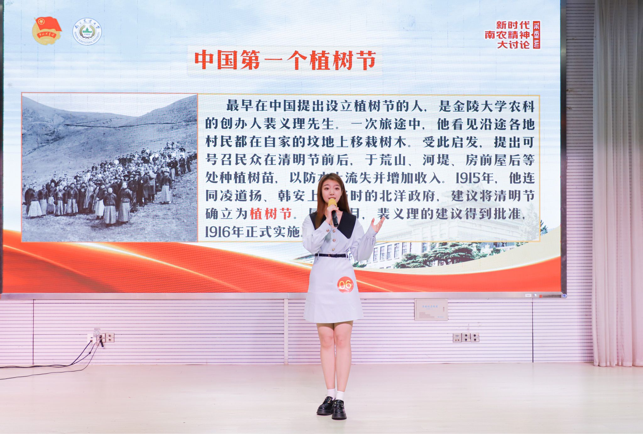 为落实立德树人根本任务,传承和弘扬以“诚朴勤仁”为核心的南农精神,彰显南农学子自信自强、守正创新的时代风貌,南京农业大学于4月19日在卫岗校区教四楼报告厅举办了“咏秾史,述秾情”主题演讲比赛决赛。