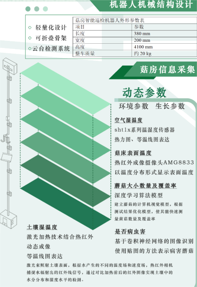 二等奖作品《基于数字孪生的智慧菇房环境参数可视化系统》利用数字孪生技术和无损检测技术,结合单片机、传感器、工业相机等硬件设备,自主设计并构建了一套智慧菇房环境参数可视化系统。该系统不仅可以对蘑菇生长环境进行实时检测,还能检测蘑菇的病害情况;利用UE4构建一个虚拟的菇房模型,通过巡检机器人检测传输数据,基于历史数据和检测数据给出环控策略,并提前发出预警,使管理员可以直观了解菇房环境与蘑菇的生长状况,为菇房的管控与优化提供更多依据。