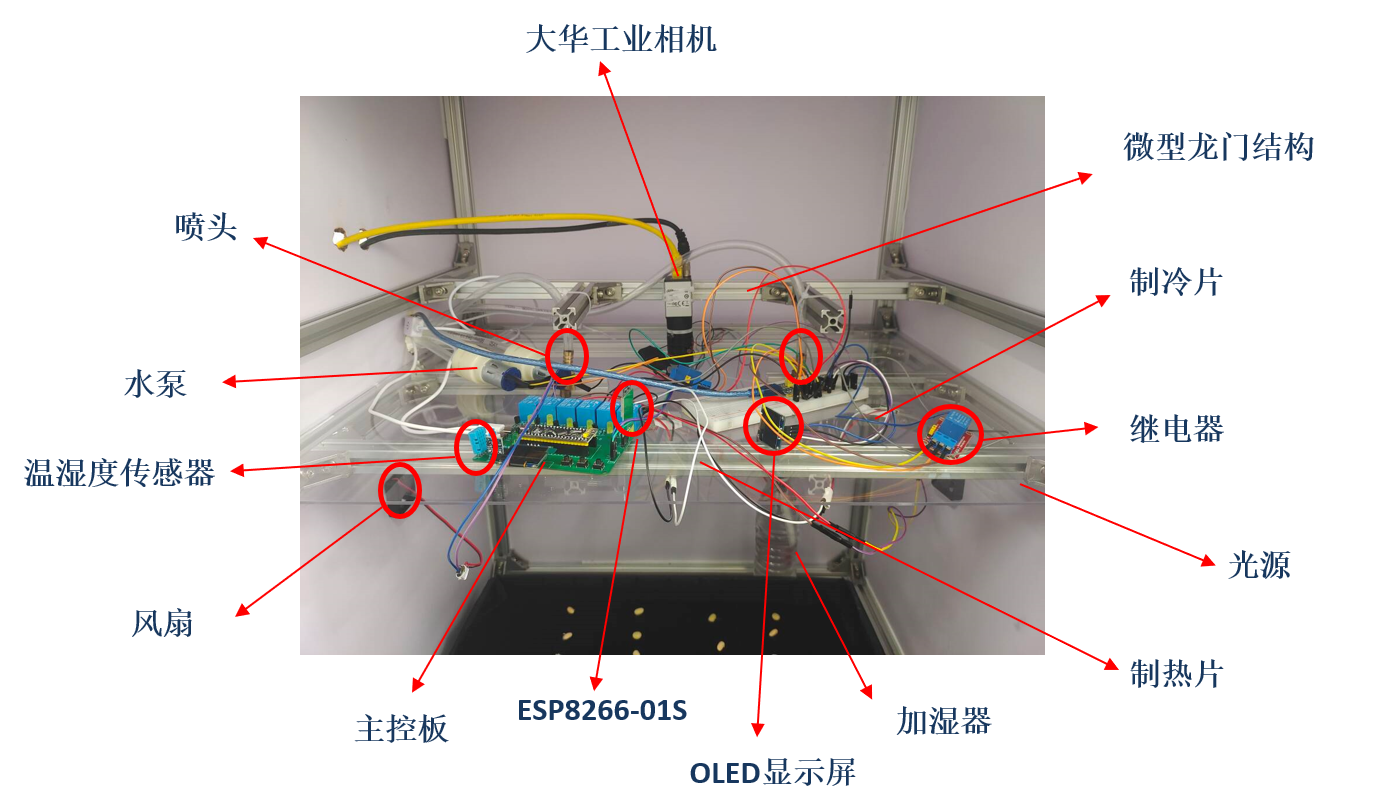 三等奖作品《动态智能考种系统》是基于机器视觉和深度学习,结合单片机、传感器、工业相机等硬件设备构建的动态智能考种系统。不仅可以实现对大豆种子萌发环境的实时控制,还可以获取种子萌发过程中的表型参数(长、宽、长宽比、面积、周长、圆形度)和根系生长参数(幼苗长度、幼苗平均宽度、幼苗面积、侧根数量),并根据上述动态时间序列数据对种子进行活力预测。