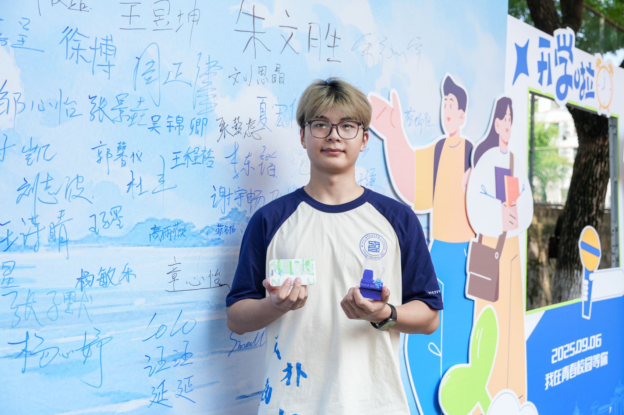 )开学啦”立体字样熠熠生辉,“你好,新同学”的暖心标语与新生们的签名交相辉映,定格下他们与学院的初见之喜。我们相信,与学院的第一次相遇值得被郑重收藏:今天为你定格的初见瞬间,将由学院悉心留存四年。待毕业季来临,学院将在滨江校区为你复刻此刻的光影,用两张跨越时光的照片,串联起从青涩入学到从容毕业的成长轨迹。